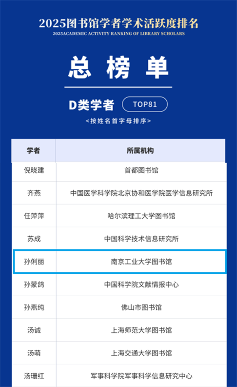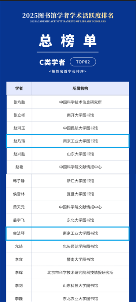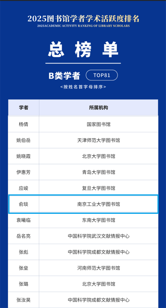 近日,“2025图书馆学者学术活跃度排名”正式发布,我校图书馆多位老师入选活跃度榜单。其中,俞琰入选总榜单B类学者,赵乃瑄、金洁琴入选C类学者,孙俐丽入选D类学者。